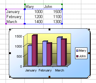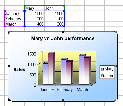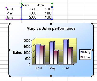 In this step-by-step demo, we'll use a combination of Excel charts and xlsgen to produce the Excel workbook that fits our need. We want a chart report to compare the sales performance of Mary and John over a three month period. Alternatively, we want to reuse the code and template for the next quarter. The resulting workbook is presented below :